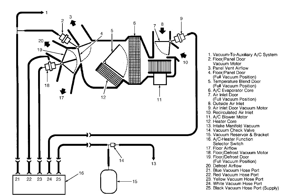 I'm working on a Ford E450. The ac is blowing through the defrost only. I understand that this is the default setting. From my research, it is common for a vacuum line to come lose. I took the dog house off on the inside of the bus and found some of the vacuum lines at the back side of the engine near where the transmission connects. There is a red plastic vacuum line that has only one end connected. The other end is not connected and there isn't a rubber boot on it. I started looking to find where the boot was and I can't find it. I did locate a small black plastic cylinder that appears to have the mushroom type end that a boot would slide on to. I am trying to find some sort of diagram so that I can make sure that it is correct. Any help is much appreciated.