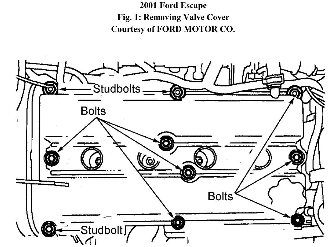 1. Disconnect negative battery cable. Remove accessory drive belt. Remove air cleaner outlet pipe. Disconnect ignition wires from spark plugs. Remove spark plugs. Disconnect throttle cable and cruise control actuator cable. On 2002-04 models, disconnect the catalyst monitor and heated oxygen sensor connectors, and detach the connectors from the bracket. Remove wiring harness anchors from valve cover studs, and position the wiring harness aside. On all models, remove valve cover. See Fig. 1 .