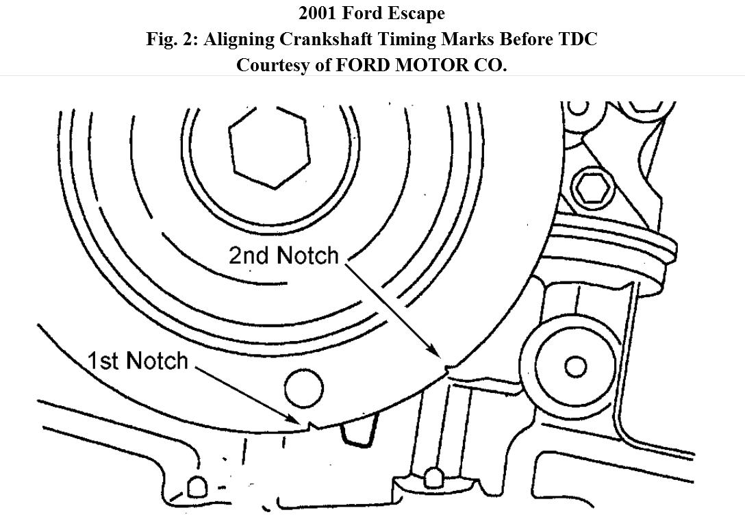 1. Slide crankshaft pulley onto crankshaft. Ensure crankshaft position is at No. 1 TDC by rotating it clockwise against Crankshaft TDC Timing Peg (303-574). Ensure second notch in pulley is indexed to lower cylinder block. See Fig. 2 . Remove crankshaft pulley.