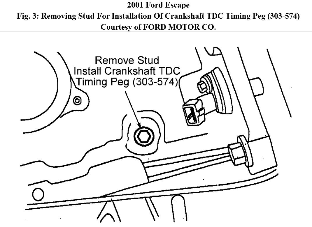 3. Rotate crankshaft to just before No. 1 cylinder TDC. See Fig. 2 . Remove stud and install Crankshaft TDC Timing Peg (303-574). See Fig. 3 .