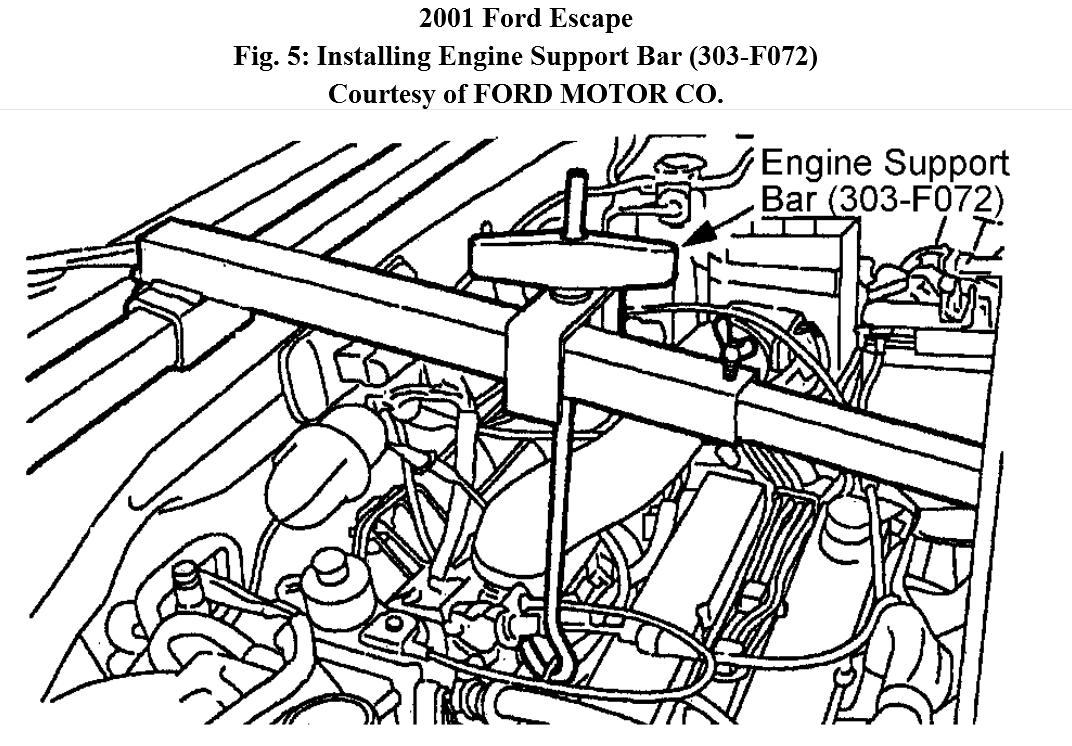 5. Loosen crankshaft pulley bolt. Rotate tensioner and remove accessory drive belt. Remove crankshaft pulley. Remove bolts and lower timing belt cover. See Fig. 4 . Install Engine Support Bar (303-F072). See Fig. 5 .