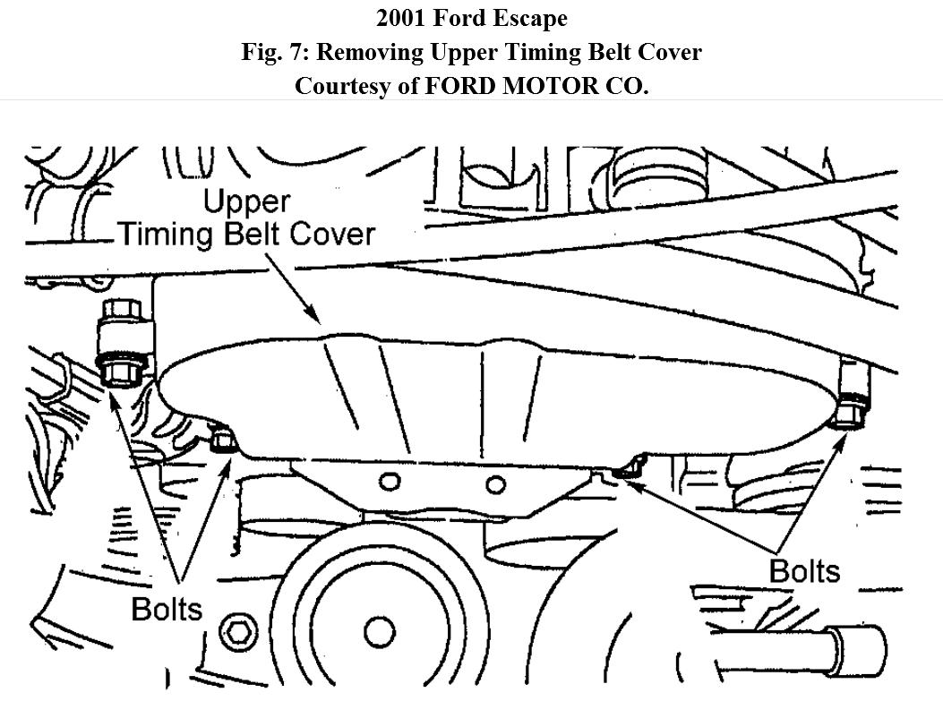 6. Remove ground strap and engine mount upper bracket. See Fig. 6 . Remove upper timing belt cover studs. Disconnect the knock sensor connector from upper timing cover, if necessary. Remove upper timing belt cover bolts and cover. See Fig. 7.