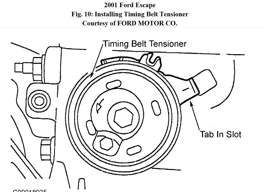 2. Ensure timing belt tensioner is installed correctly with tab positioned in slot in inner timing cover. See Fig. 10 .