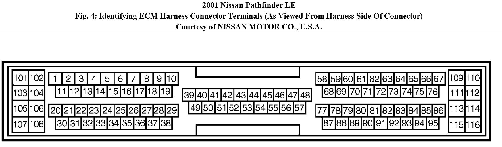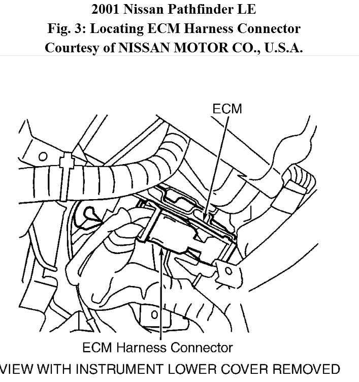 2. Turn ignition off. Disconnect ECM harness connector. See Fig. 3. Check continuity of