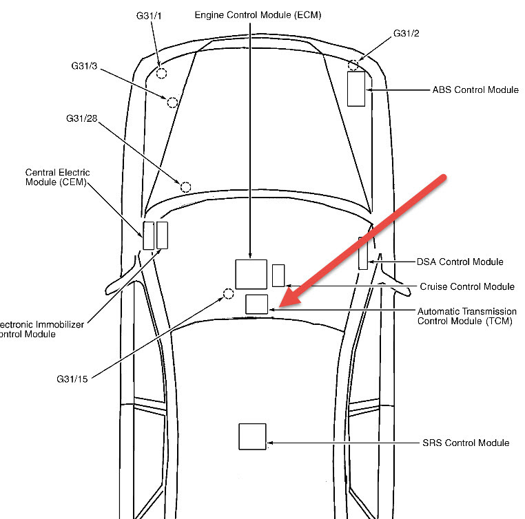 The transmission control module is located under the center console. Check out the diagrams (Below). Please let us know if you need anything else to get the problem fixed.
