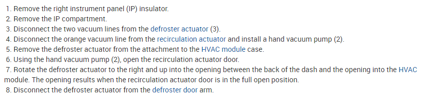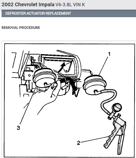 I've attached picture steps below on how to remove and replace the defroster actuator below and its location on your Impala . Hope this helps and thanks for using 2CarPros.