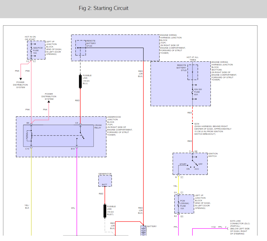 I have attached a schematic of the starting system for you to look at. There are a few things I need you to check. First, from the positive remote (under the hood) power is supplied to the ignition switch via a red wire. Check at the switch to make sure it is hot. From there, it follows a yellow wire to the PCM crank fuse (10 amp). Make sure it is not blown and make sure you have power in that wire with the key in the start position. After the fuse, the wire in question is purple and runs to the PCM crank request/crank relay control in the air box (check for power). If there is still power, the wire to follow is yellow with a black tracer which runs to the under-hood junction block (pin C10). (check for power) From there, power comes out from a purple wire (pin B10) and goes to the starter solenoid. Check for power. Keep in mind, the purple wire actuates the solenoid and energizes the starter. However, the true power to the starter (to turn it) is always hot. It is the big wire directly from the battery. Also, all of the places I said to check for power needs to be done with the key in the start position, and there should be twelve volts present. If you have power throughout the map I sent you, the starter system has been checked. Which leads me to the next question. Are all the wires in the junction block (under the hood) clean, tight, and not corroded?