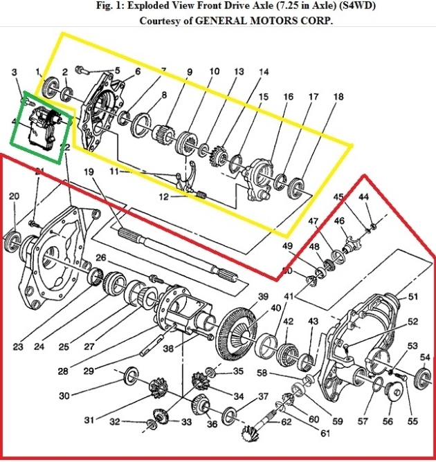 I did more research and found this exploded view of the front differential, you can see the fork and slider assembly, same theory but different location. See number 11, 12 and 13