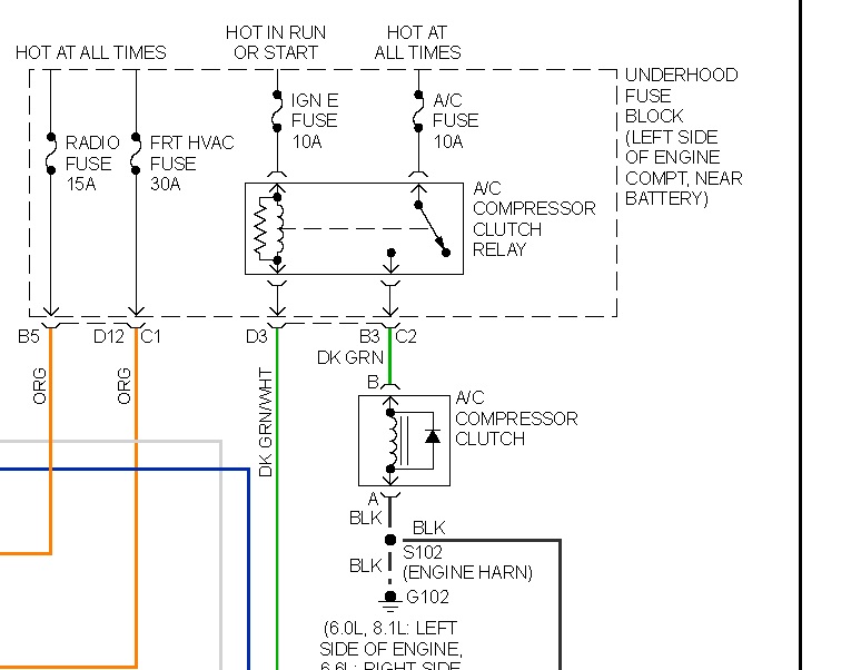 Does the compressor run? Any applicable trouble codes? In the diagram, you can see the fuses for the compressor clutch relay. Not only check the fuses, use a voltage tester, see if fuse circuit has voltage when it should. One is hot all the time, the other goes hot when you turn on the key. When the relay is energized, that arm with the arrowhead moves to the green wire. The green wire is voltage to the compressor, black wire is ground. The compressor won't run without voltage and ground.