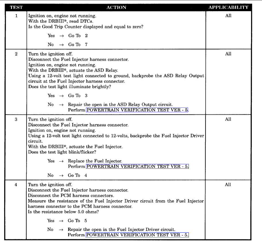 I can't stress enough that all of the injectors did not fail at the same time, and I have never come across a bad one in a Chrysler product since I started at the dealership in the early '90s. By replacing them as a test, you run the risk of cutting an o-ring, breaking the fuel rail, or not getting the o-rings seated properly. If they got plugged with gunk, you have much bigger problems as that is not all that is going to be contaminated. The biggest culprit is mold growing in the fuel tank. It feeds on the ethanol in today's gas. That mold, along with other microscopic debris, will plug the pick-up screen on the bottom of the fuel pump housing, then the symptom will be stalling when the largest volume of fuel is being pumped, which is during coasting down from highway speed. Most people attack the fuel filter for that, but other than with diesel engines, you will never solve a running problem on a Chrysler product by replacing the fuel filter. They often last the life of the vehicle unless they rust out and start to leak. That plugged sock on the fuel pump's housing, on the other hand, is not that uncommon.