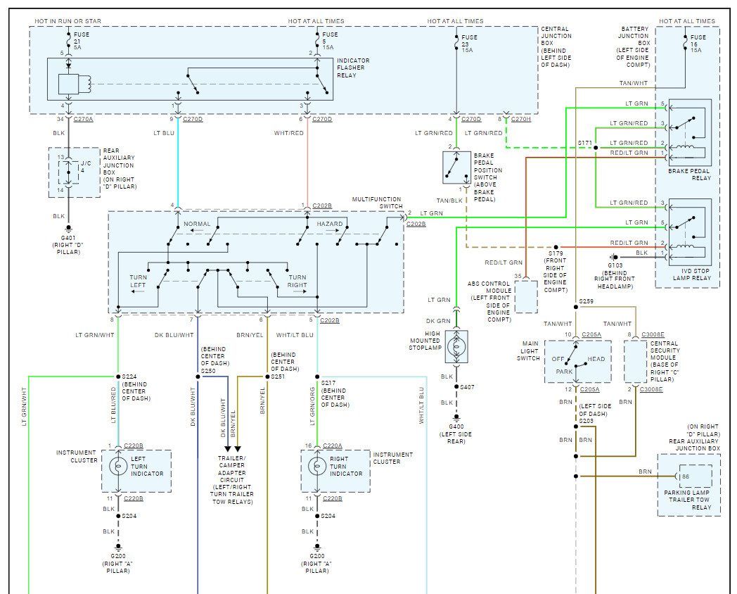 These might be separate problems, but we have some fuses to check first. Here is a guide to help and the headlight and blinker wiring diagrams so you can see which fuses to check and how the system works.