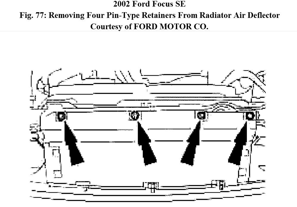 3. Remove the four pin-type retainers from the radiator air deflector.