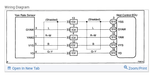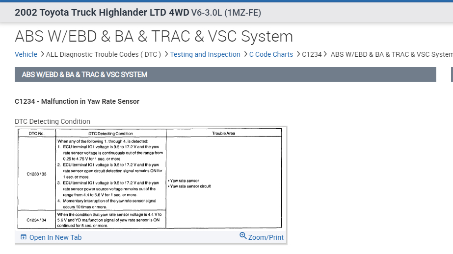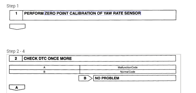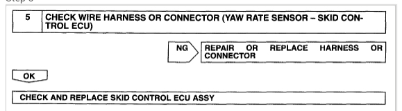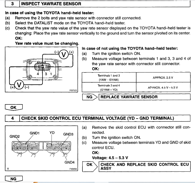 calibration of yaw rate sensor undone and c1336 zero point calibration of deceleration sensor undone and c1234 yaw rate sensor. Followed tis procedures. Proceed to perform zero point calibration of yaw rate sensor. Dtc codes c1210 and c1336 cleared. Code c1234 remained, followed tis procedure inspect yaw rate sensor using data list, place the yaw rate sensor vertically to the ground an turn the sensor pivoted on its center, yaw rate value changes. Then proceed next step to check skid control ecu terminal voltage, terminals yd and of skid control ecu is good. Voltage on test is 4.73v which is between the specs of voltage 4.5-5.3v. Next step is to replace skid control ecu