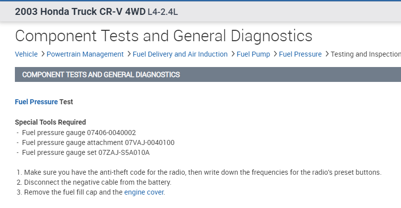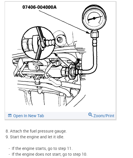 As a result, we need to check fuel pressure. I attached the directions specific to this vehicle for testing. Take a look through them and let me know if you are comfortable performing them. You will need a fuel pressure gauge, but most parts stores will lend one to you.