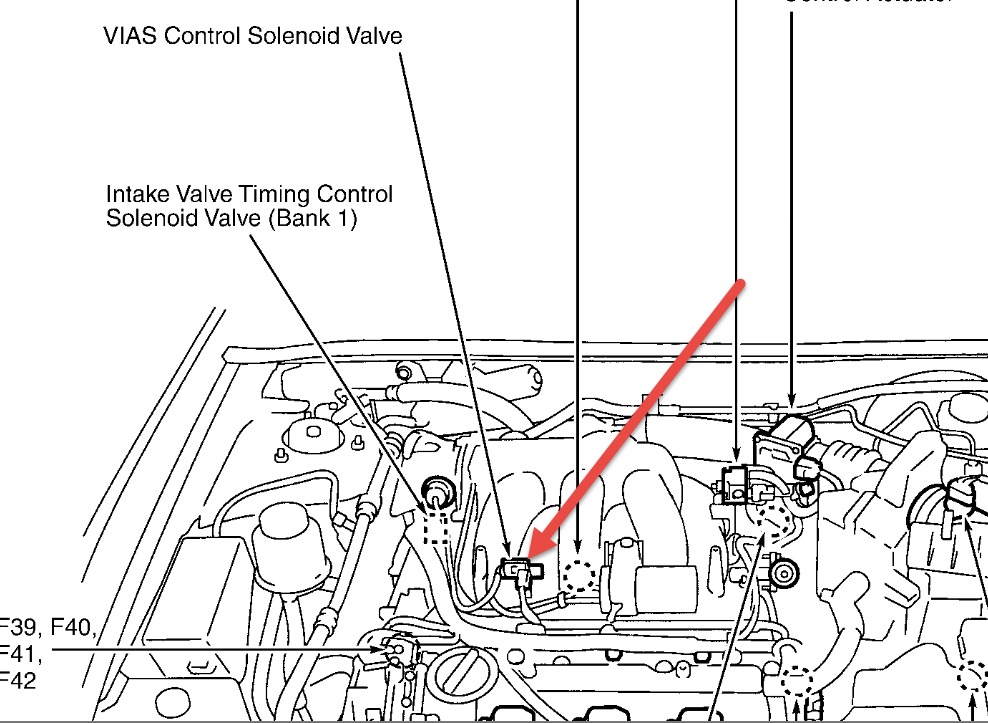 code 1800 may be your problem it's the variable induction air control system solenoid. It also may be a vacuum leak the other codes deal with knock sensor and evap system but the 1800 code may be causing at least one of those. BTW there is no code 455. arrow in pic points to part