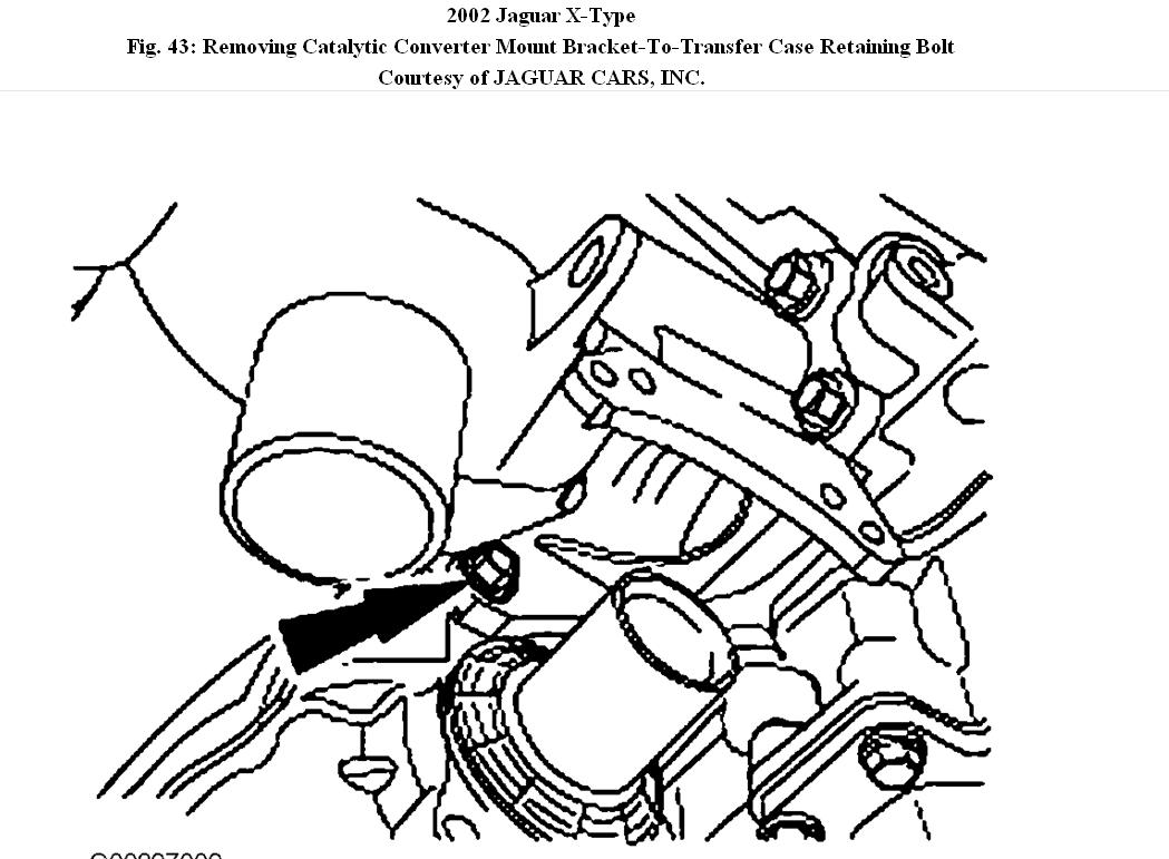 Fig. 43: Removing Catalytic Converter Mount Bracket-To-Transfer Case Retaining Bolt Courtesy of JAGUAR CARS, INC.