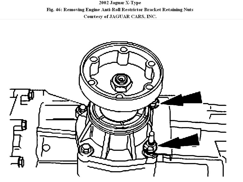 Fig. 46: Removing Engine Anti-Roll Restrictor Bracket Retaining Nuts Courtesy of JAGUAR CARS, INC.