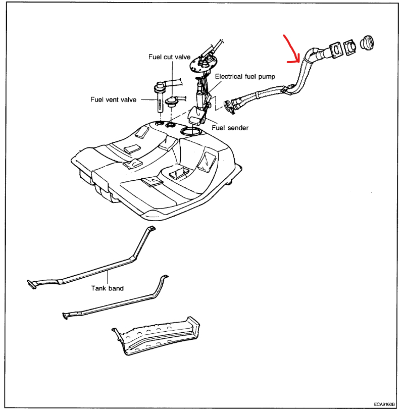 What happens is the filler neck vent tube becomes kinked or the hose fallen apart internally. Here is the location of the vent tube so you can check it out. Check out the images (below). Please let us know what happens.