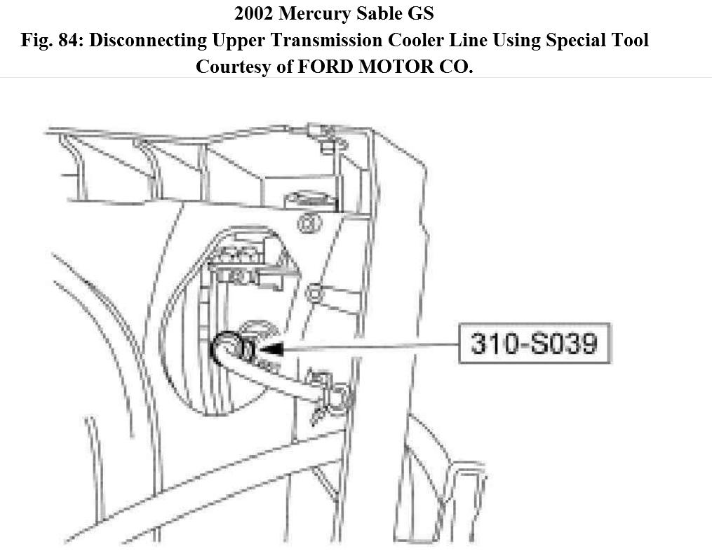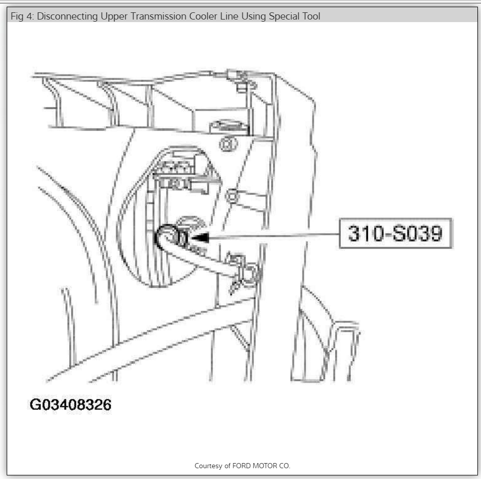 Fig 3: Disconnecting Degas Return Hose. Using the special tool, disconnect the upper transmission cooler line.