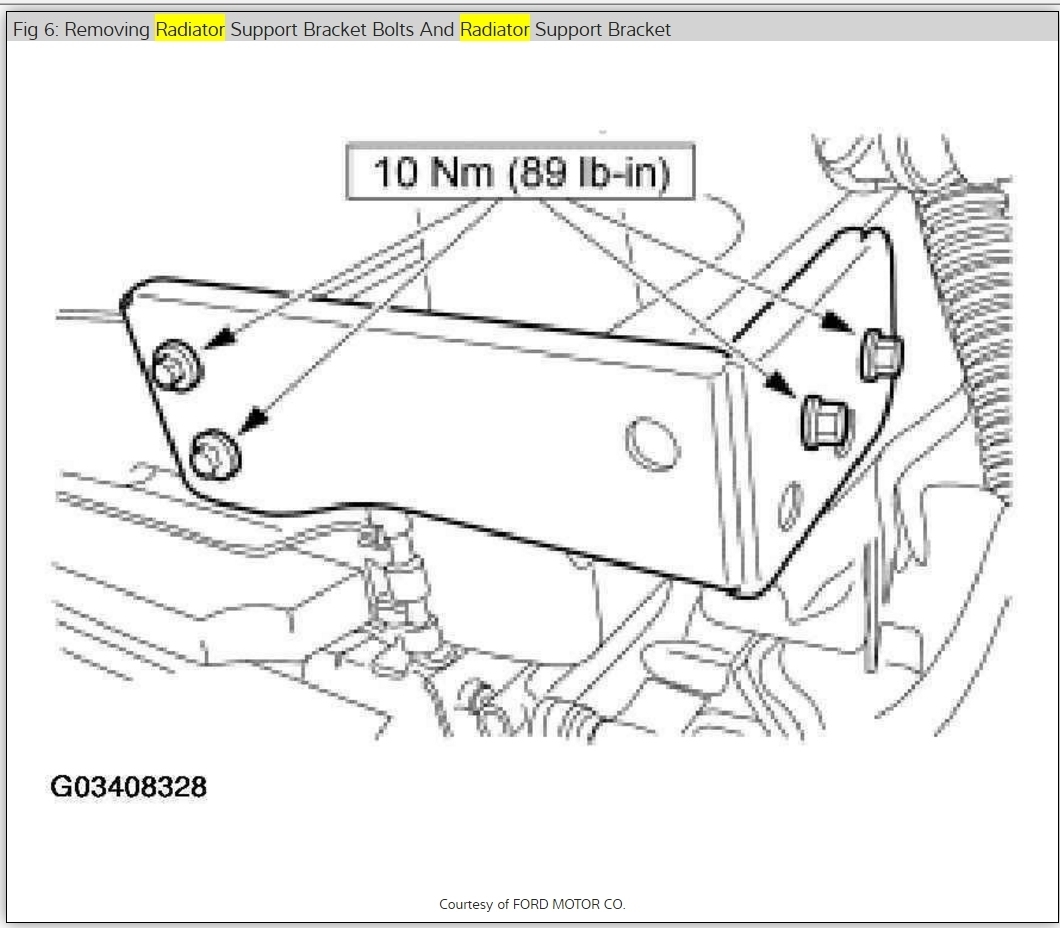 Fig 6: Removing Radiator Support Bracket Bolts And Radiator Support Bracket. Disconnect the lower radiator hose.