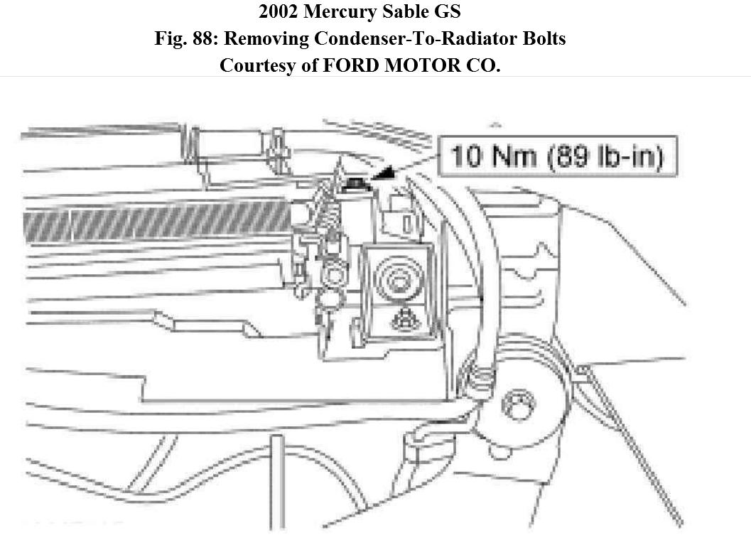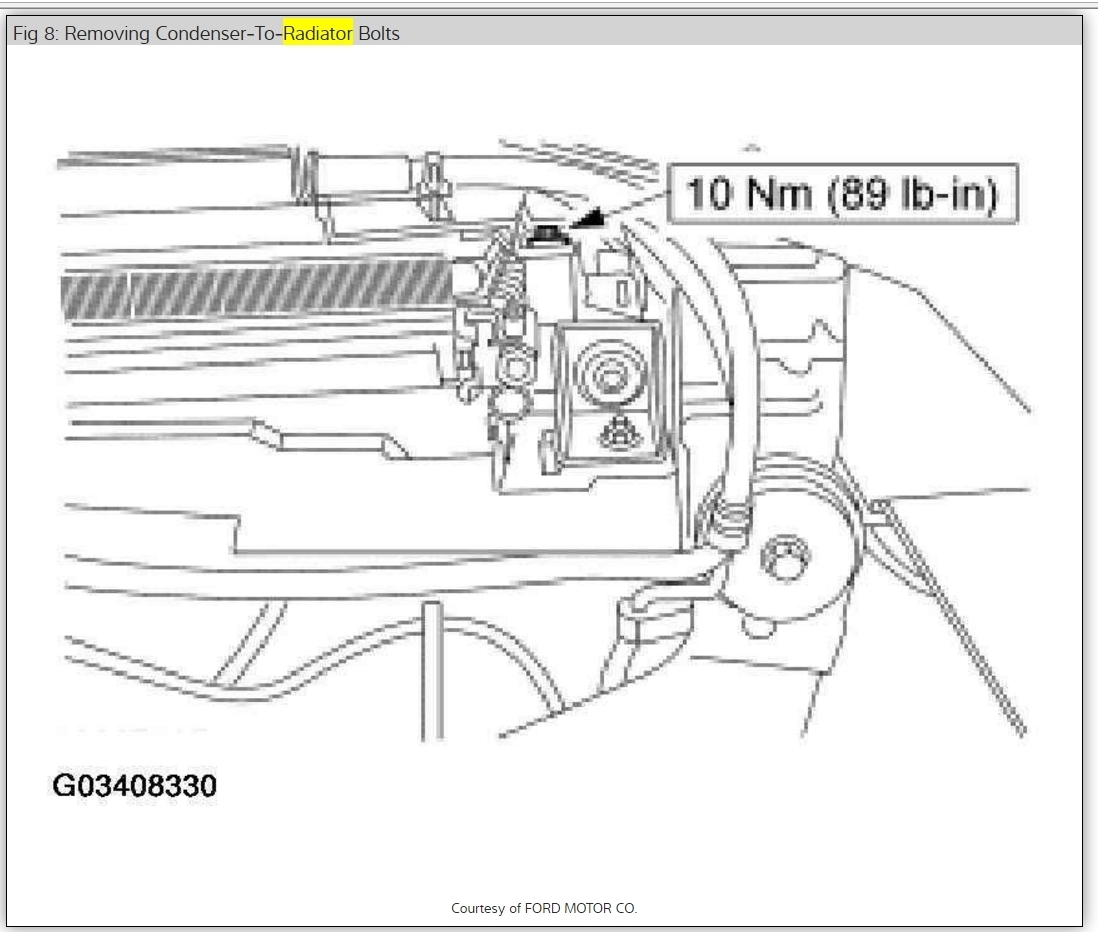 Fig 8: Removing Condenser-To-Radiator Bolts. Secure the A/C condenser. Remove the bolt retaining the P/S cooler to the radiator.