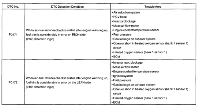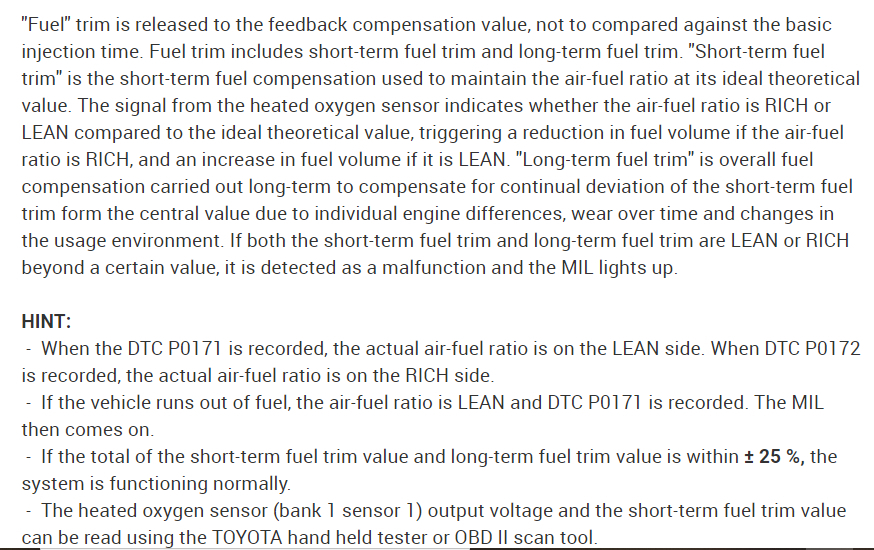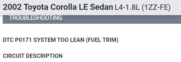This code means the engine is running lean. Unmetered air is being introduced into the engine by a leak causing this condition. I've attached picture diagnostic steps below for this code. Hope this helps and thanks for using 2CarPros.