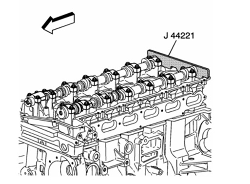 •Install J 44221 with the camshaft flats up and the number one cylinder at top dead center.