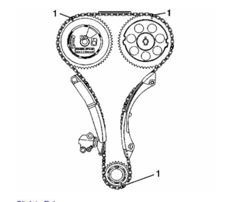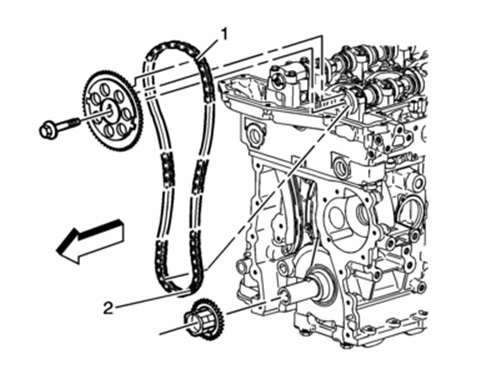 •Install the timing chain onto the crankshaft sprocket. Align the (dark) link of the timing chain with the timing mark on the crankshaft sprocket (2).