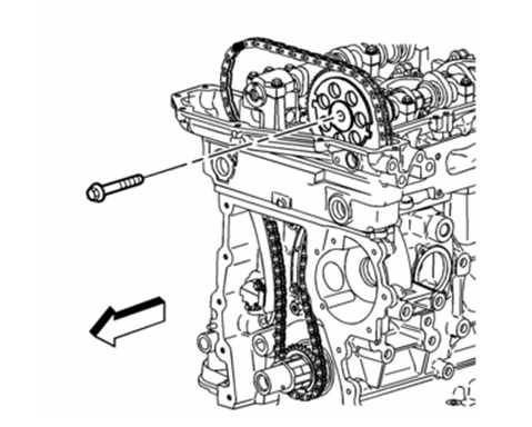•Add threadlock GM P/N United States 12345498, GM P/N Canada 10953488 to the top chain guide bolt threads.