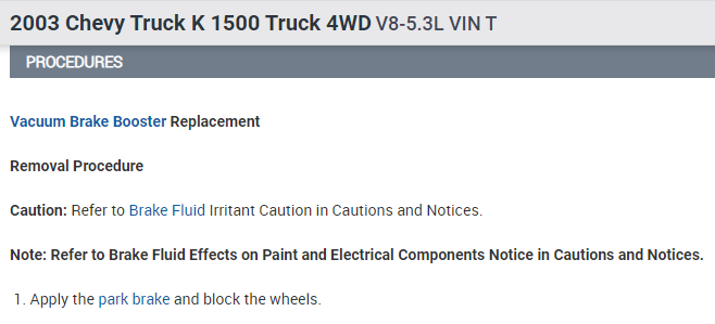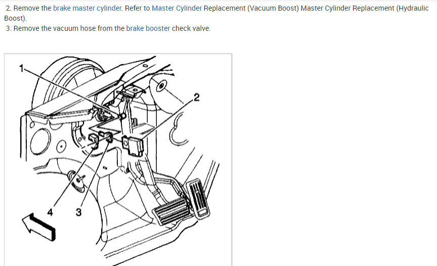 Here is the information you requested. Be sure to just move the brake master cylinder slightly out of the way so that you don't have to open a line and then have to bleed the brake system. I've attached picture steps below on how to change the power brake booster on your truck. Hope this helps and thanks for using 2CarPros.