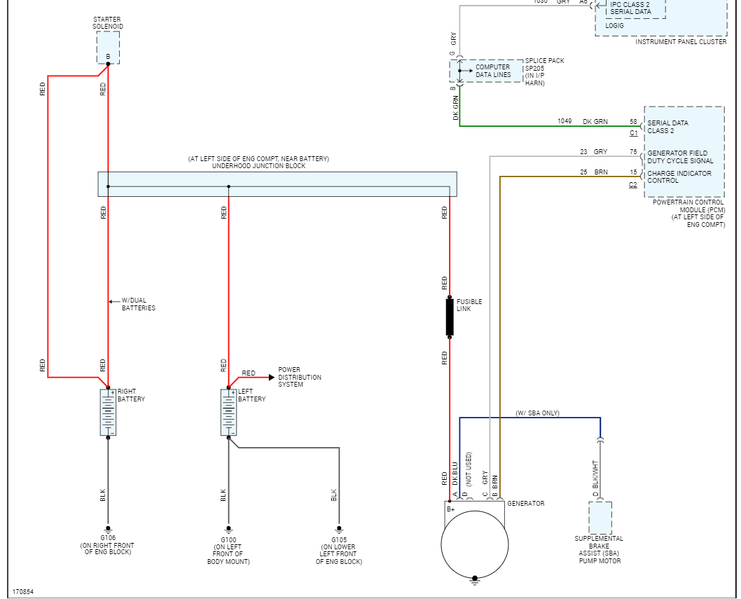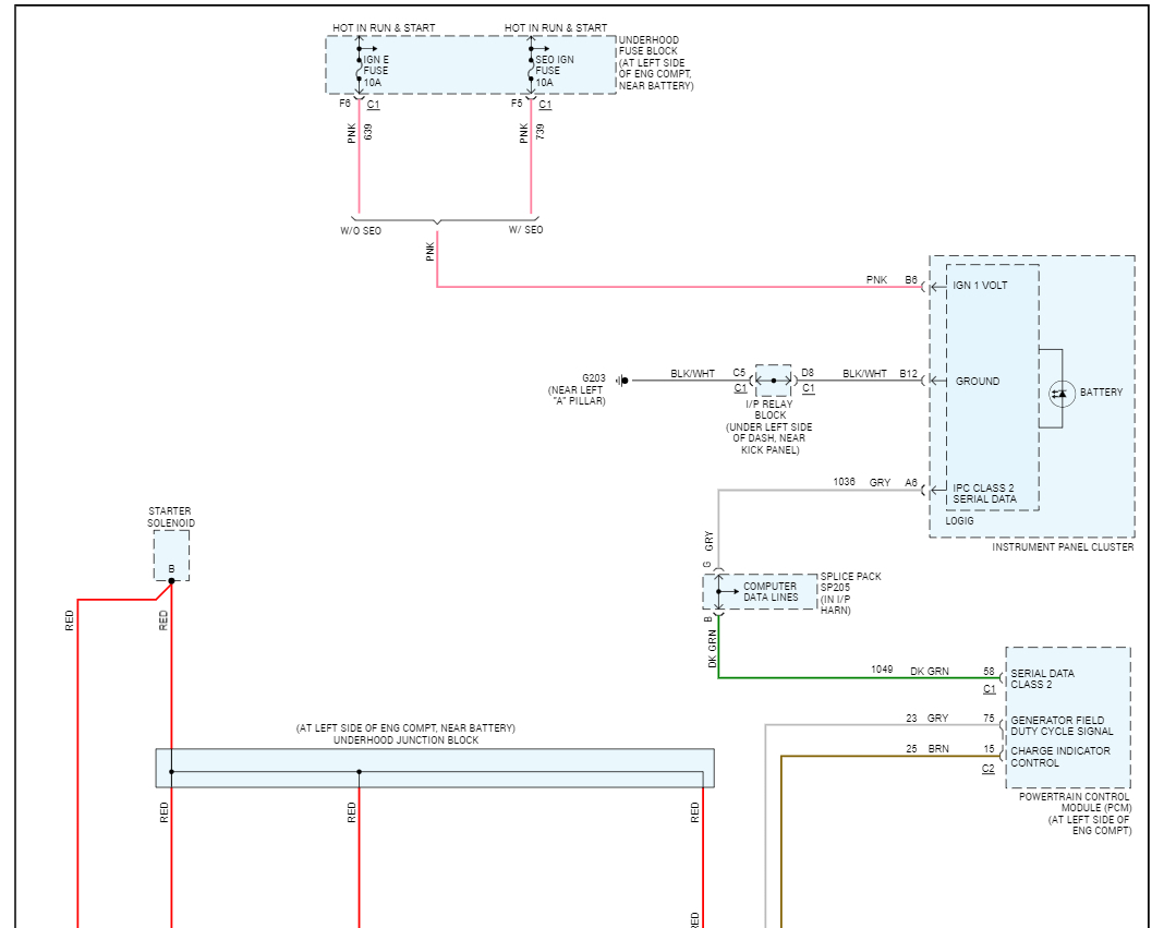 Here are the wiring diagrams that show the alternator and charging system and how it works. Please go over it to see the two regular fuses that run the system: IGN E and SEO IGN both 10 amp which are located in the under-hood fuse panel (red arrow). Check out the images (below). Please let us know what happens.