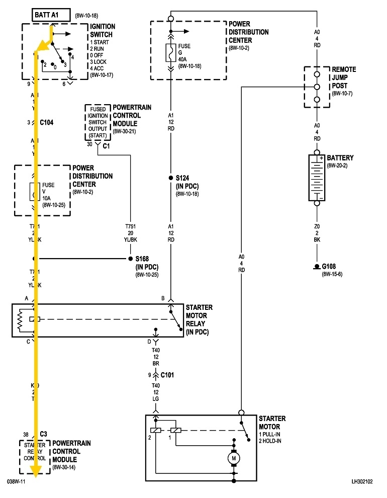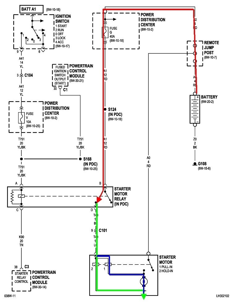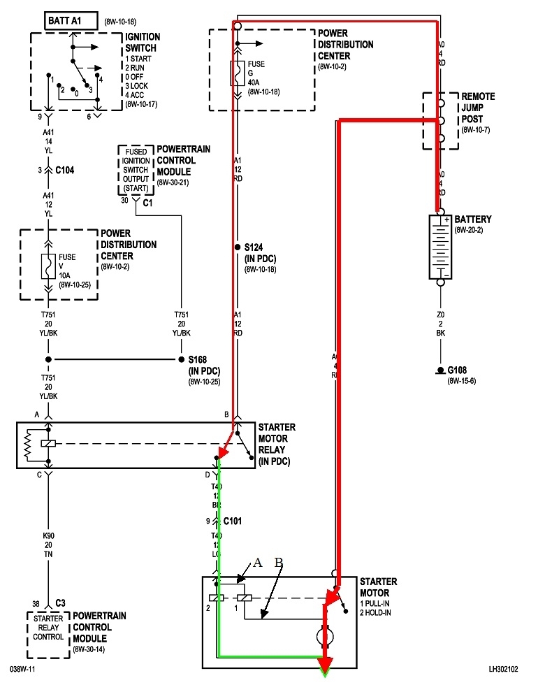 Is The light green wire that comes from the starter motor a power wire or ground? Because that's one of the wires that I had to splice together from the starter motor. I need to know if it's ground or power that way I could check it. Because it goes up to the engine starter motor relay can that stop the coils from tiring.