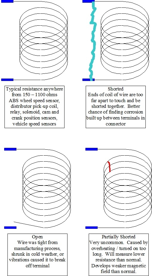 Drawings 1 and 3 are what you're going to run into on a regular basis. It's good, regardless of its actual resistance, or it's open. One quick measurement is all that's needed. The defects in the second and fourth drawings result in resistance lower than normal. The fourth one won't develop its full magnetic field so it could operate sluggishly and / or intermittently. It might only operate when the engine is running due to charging system voltage being a volt or two higher than battery voltage. This can also be why a starter solenoid engages when the vehicle is getting a jump-start, but not when trying to crank just on its own battery. The important point is resistance didn't go higher than normal in the three defects except for the open circuit.