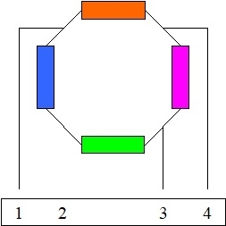 If you measure between terminals 1 and 2, the current supplied by your meter will flow through the blue coil, but a little will also flow through the orange coil, then the purple coil, and then then green coil. Those three coils are in "series" during this test. Their total resistance adds up to 30 ohms. Unless you're a circuit designer, doing the math is of little value. With two paths for current to flow, overall resistance is lower than just that of the blue coil.. Okay, I did the math anyway and came up with 7.5 ohms. What is important to know is you should find very close to the same reading when you measure across any one of the coils. That's between terminals 2 and 3, terminals 3 and 4, and between terminals 4 and 1.