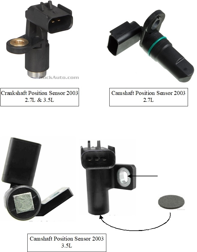 I don't mean to confuse the issue, but the lower photos show the camshaft position sensor for the 3.5L engine. This one does need the spacer. It's shown attached to the bottom of the left photo, and the replacement is shown at the right side for when you want to reinstall a good sensor that was removed for some other service. In the middle, the arrow is pointing to the elongated hole for the mounting bolt.