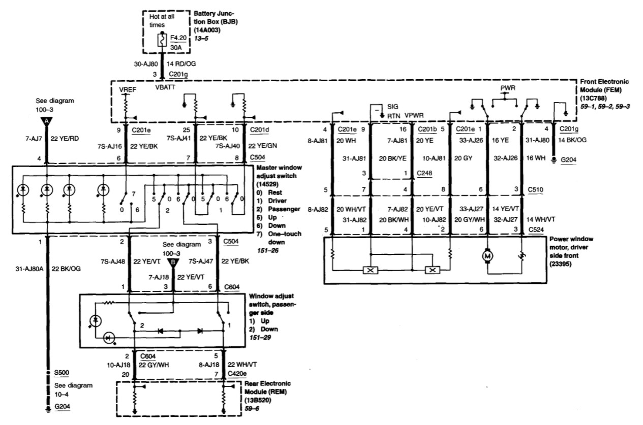 If I understand your question correctly, it seems like your driver's side window will not roll down at all. This could have several causes. First, you may want to confirm that you have power to the Front Electronic Module which communicates with the window switches. This should be fuse 20 in the rear battery junction box (BJB).