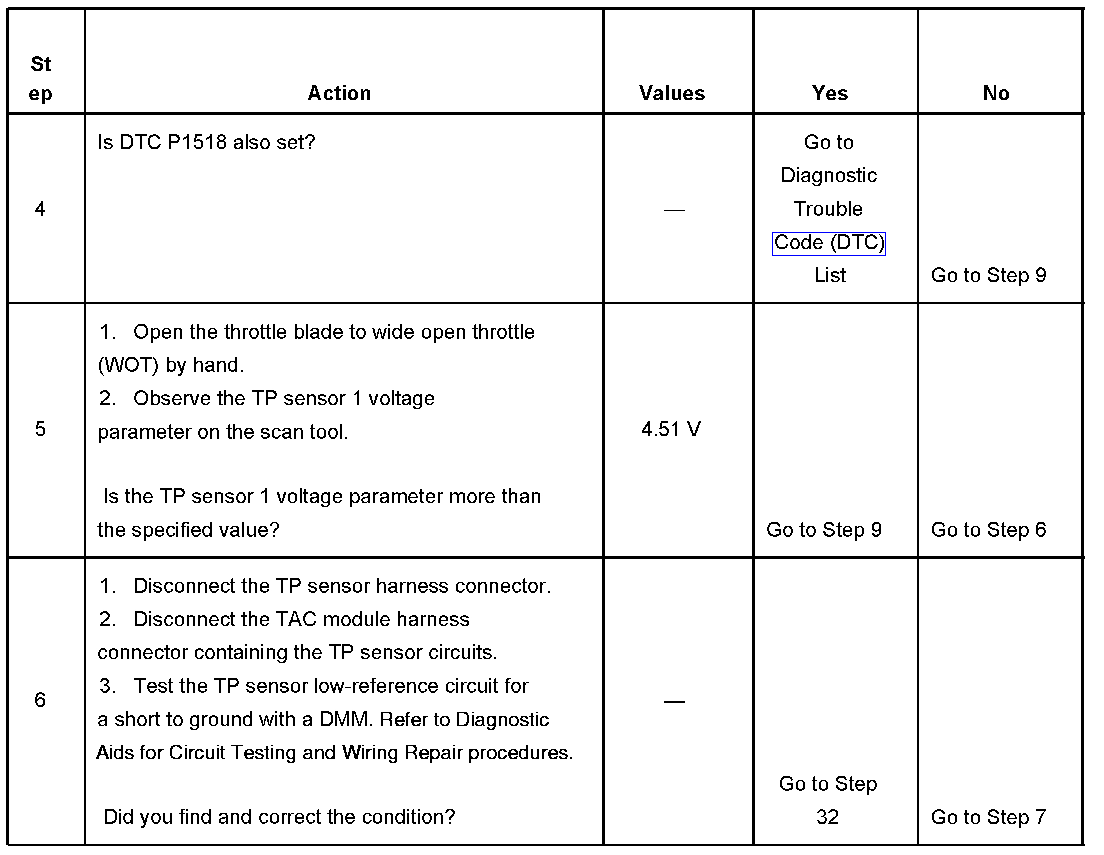 5. Increasing the engine speed to 3,000 RPM aids in locating a shorted throttle actuator motor control circuit. Depending on the polarity of the throttle actuator motor transistors, this DTC may not set with a fault in the control circuits. The throttle actuator motor is a bi-directional DC motor. Raising the engine speed changes the polarity of the transistors in the throttle actuator motor. This occurs because 1 set of the transistors are low, 0 volts, and the other set are high, B+. Therefore, if 1 set of transistors are at a low voltage and the corresponding circuit is shorted low, DTC P1518 will not set. When the polarity of the transistors change, this DTC sets. If this DTC does not fail this ignition, continue to monitor this DTC status while moving related harnesses and connectors.