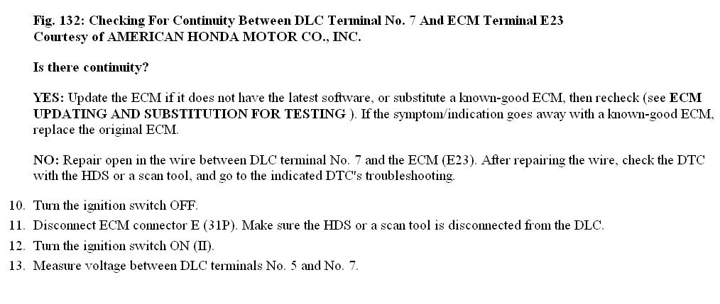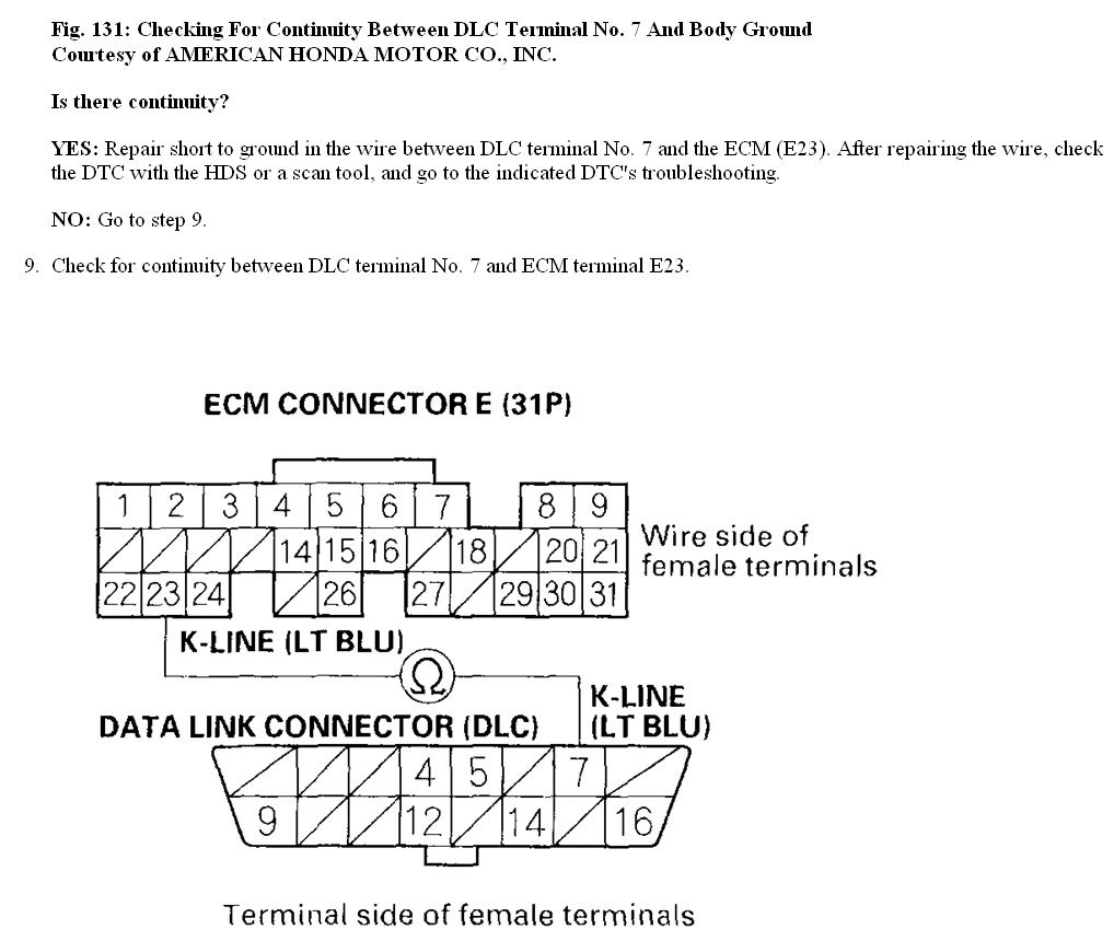 i did get a good check for continuity between pin 7 and e23(while unplugged from ecm) Should i check and see if there is a short between pin 7 & any other pin in e23 plug if there are no shorts between pin 7 and plug e23, where else should i be checking ? i was able to subscribe to alldata as well. so with this and your help and the borrowed scanner hopefully i'll make headway to a solution. thanks