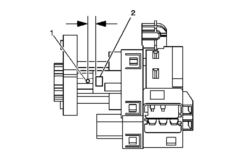 2. Locate the surface for the release button (2) for the ignition switch lock cylinder on the plastic ignition switch housing. Center punch a location (1) on the rib approximately 3/8 inch reward, toward the key entry end, from the cylinder release button.