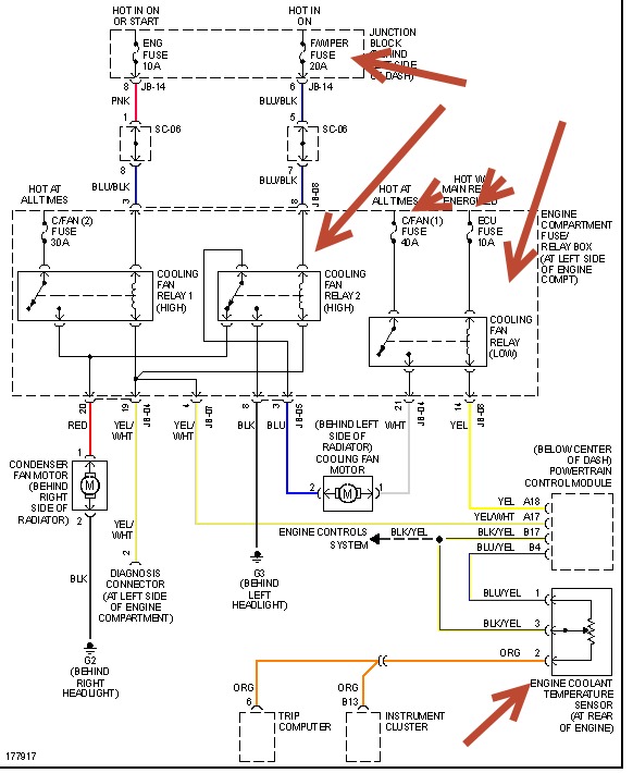 we don't have this model in us. but am sending a cooling fan circuit from a Sedona so it may be similar to this. if this is a diesel the cooling sensor is probably in wrong place. see pic.
