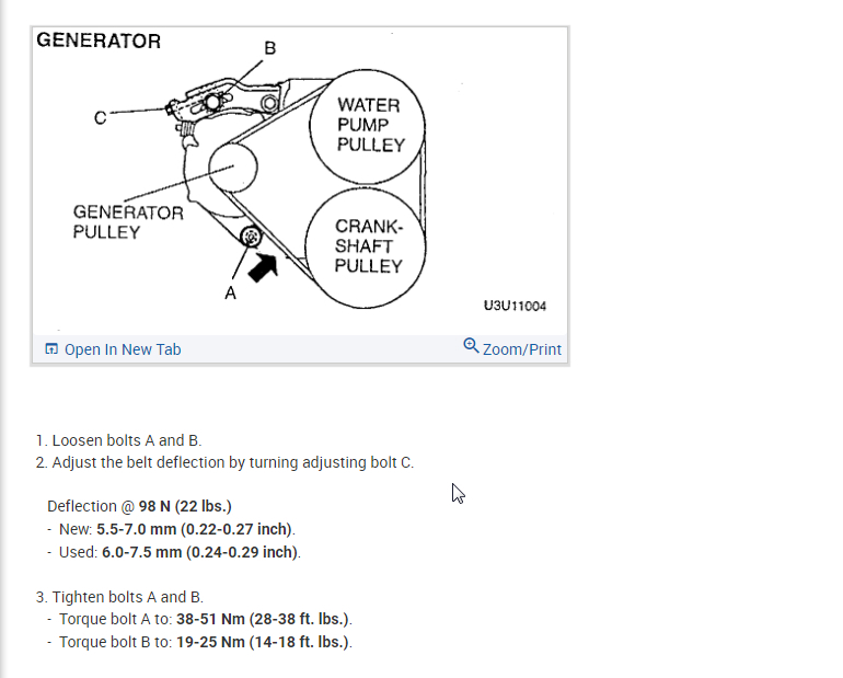 So if I got this right. For each of the two drive belts, we loosen bolts A and B on both the alternator belt and the power steering belt and then loosen bolt C on both the belts to remove them. Once that is done the 2 new belts can be installed. Then tighten bolts A and B, then tighten bolt C to apply tension. Measure the tension from the spec provided by KaseKenny and we're done ?