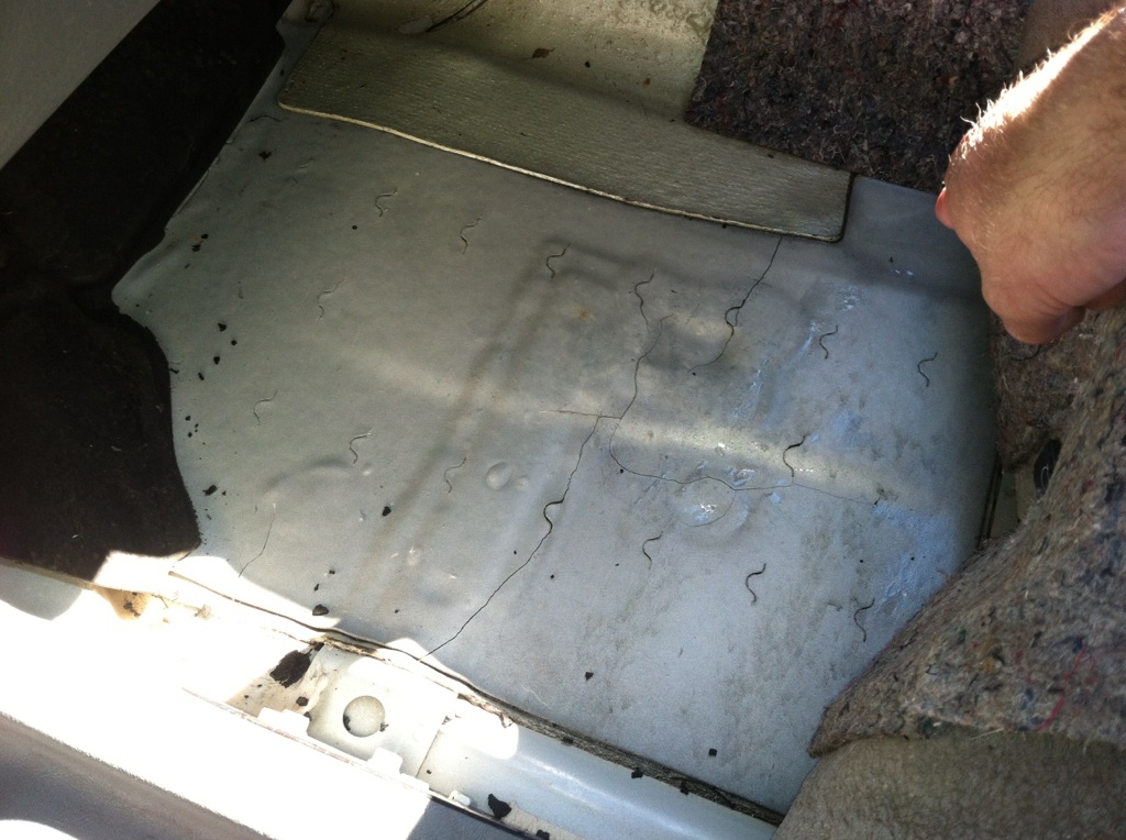yur floor appears to be cracked from the picture. but have your bf put silicone where the sheet metal comes together under the car if he can. if not do it on the floor board and let it dry at least overnite. without really looking at this it will be hard to properly diagnose.