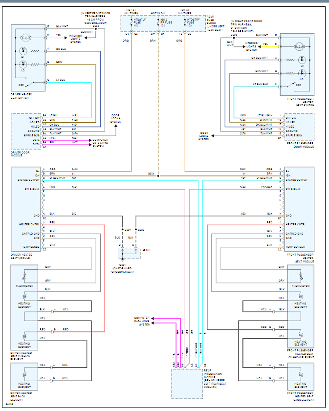 I am attaching the wiring diagram. Assuming this is only one of the front seats that is not working, we need to know find out if the switch light turns on when you press the button. If it does then this is either the door module, or the heater itself.