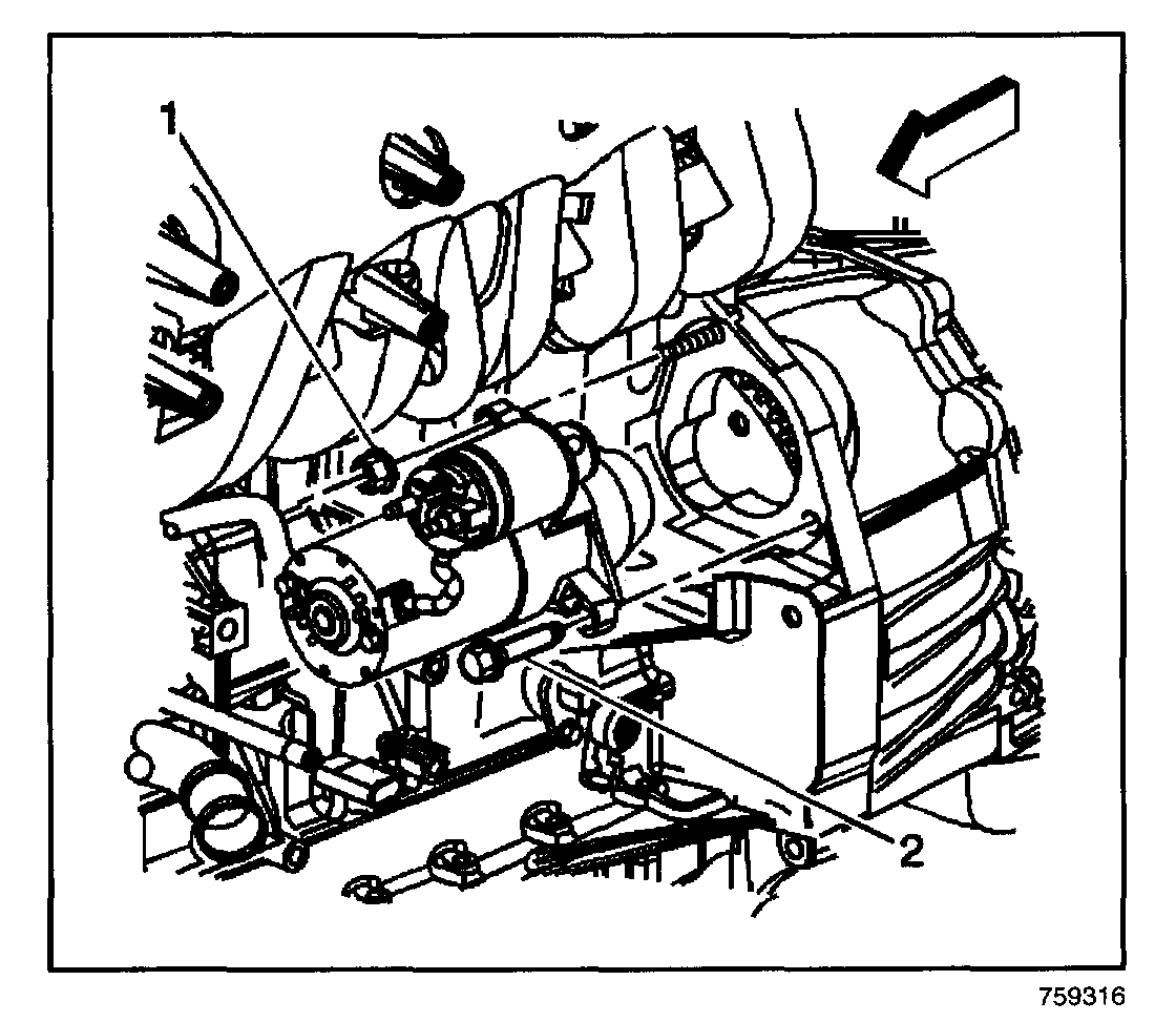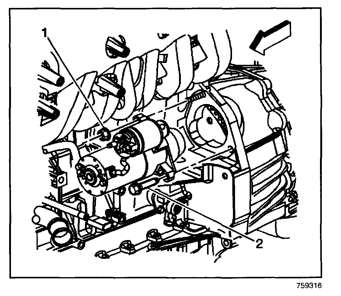 6. Remove the starter mount bolt and nut (1, 2).