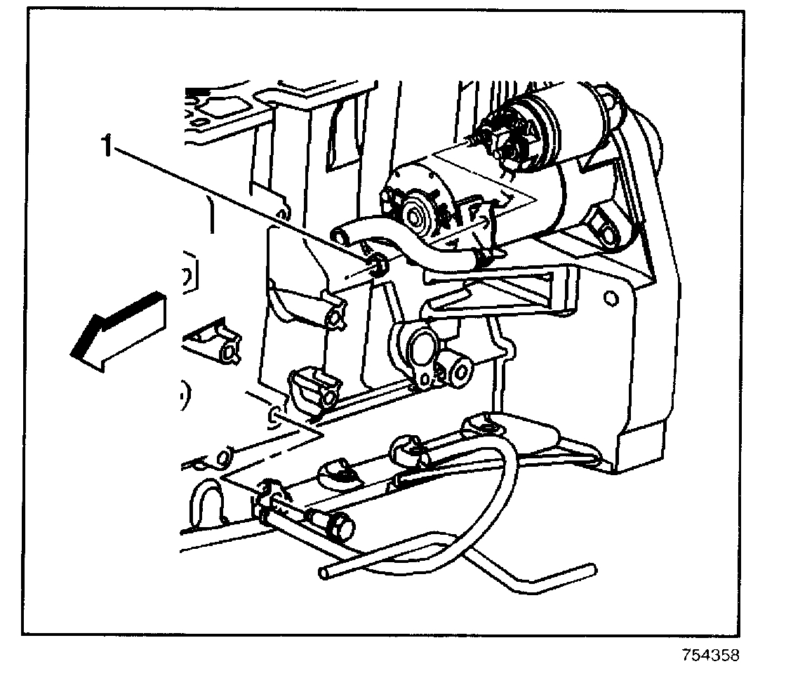 3. Remove the battery positive lead from the solenoid (1).