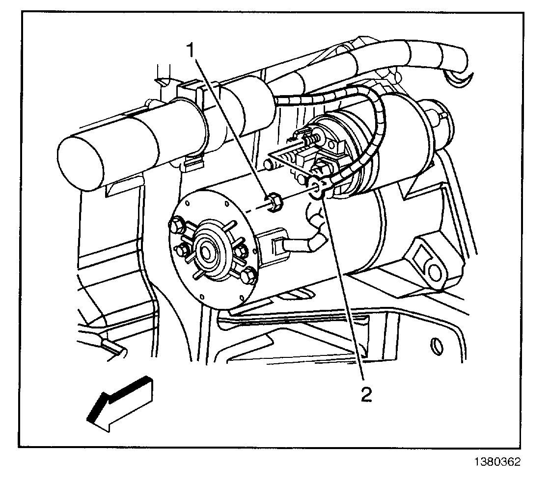 2. Install the starter motor mount bolt (2) and nut (1).