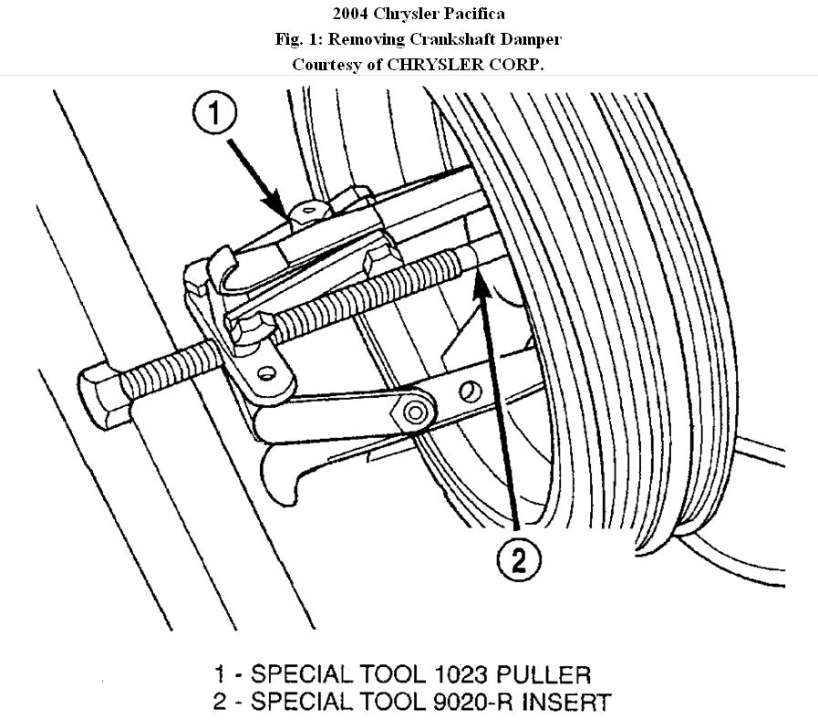 7. Remove crankshaft damper bolt. Using Puller (1023) and Insert (9020-R), remove crankshaft damper. See figure 1 .
