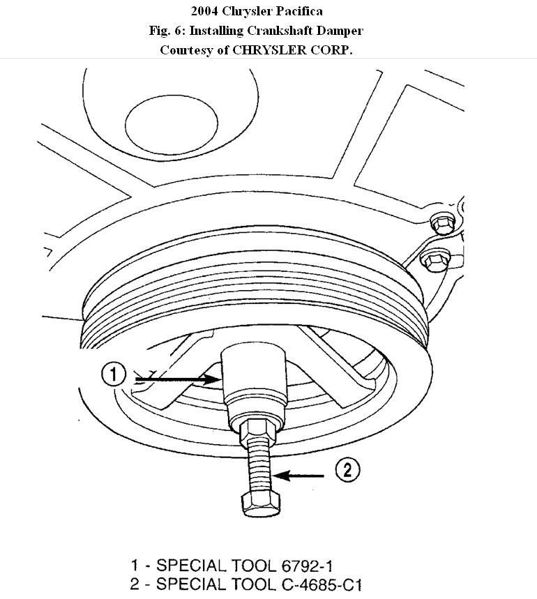 12. Install crankshaft damper using 5.9" Bolt With Nut (C-4685-C1) and Thrust Bearing (6792), and Installer (6792-1). See Fig. 6 .