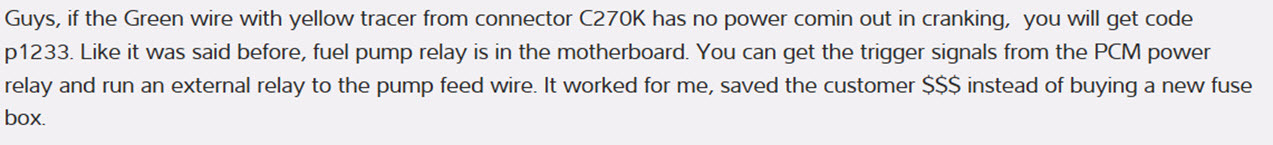Vehicle stalls, mechanic replaced fuel pump, now states it is the fuel pump relay. However, mechanic also states that the fuel pump relay is built internally to the Central Junction Box and cannot be serviced, the complete junction box needs to be replaced. Is this true? If not does anyone know where the fuel pump relay is? Owner manual shows location of fuel pump fuse, 20A fuse but states nothing about a fuel pump relay. Vehicle will now not start at all.