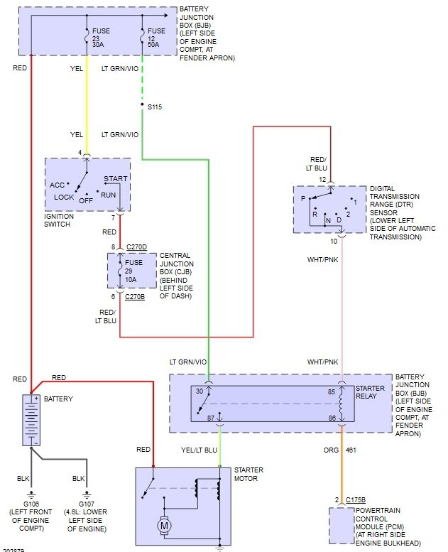 First check fuses 12, 23 in the under hood junction box and fuse 29 in the left side fuse box under the dash. Use a test light and verify power at both sides of the fuse. Next check the starter relay in the under hood junction box. With the test light you should have battery voltage at pin 30, When the key is turned to start with the shifter in park or neutral you should now have battery voltage at two pins, 30 and 85.